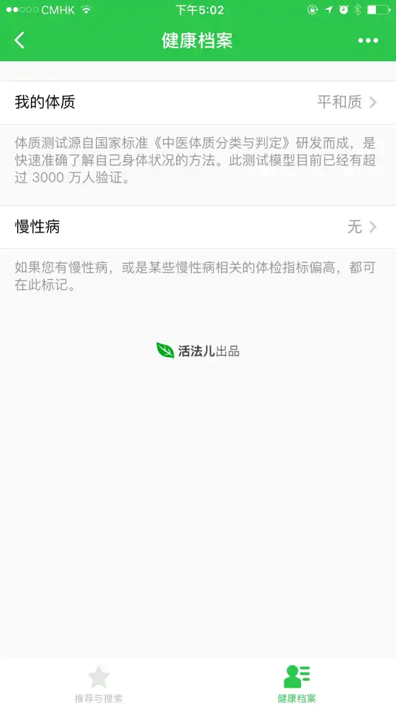 Users complete a health questionnaire by answering a series of questions. The app then generates a list of recommended foods that are appropriate for their physical condition and health status.