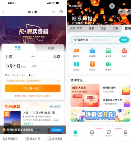 Ctrip and Qunar are two online travel agencies. Users can book hotels, air tickets, train tickets and bus tickets through the mini program.